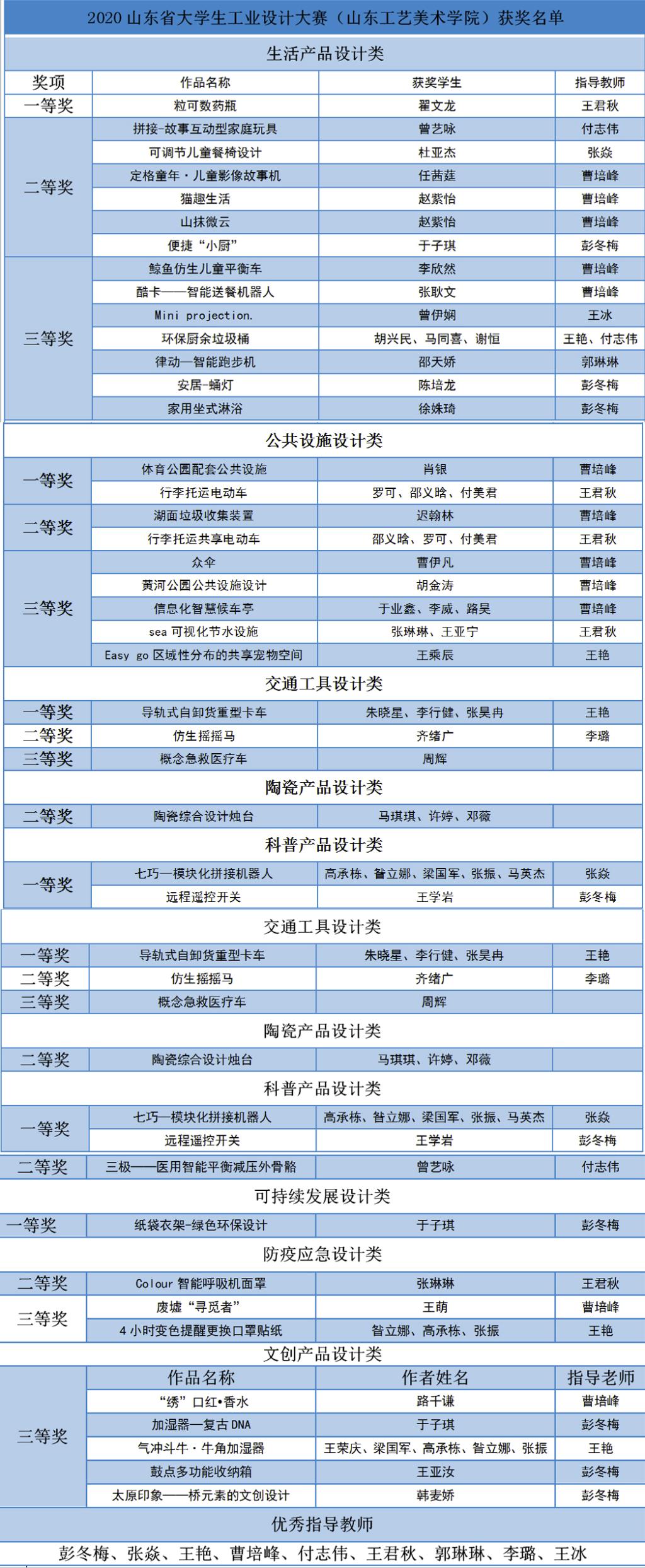在近日举行的“山东省大学生工业设计大赛”中,工业设计学院教学团队积极组织18级学生参与比赛。在大赛的八个类别中,工业设计学院学生共获得一等奖7项,二等奖12项,三等奖20项;9位老师获评优秀指导教师,取得可喜成绩。