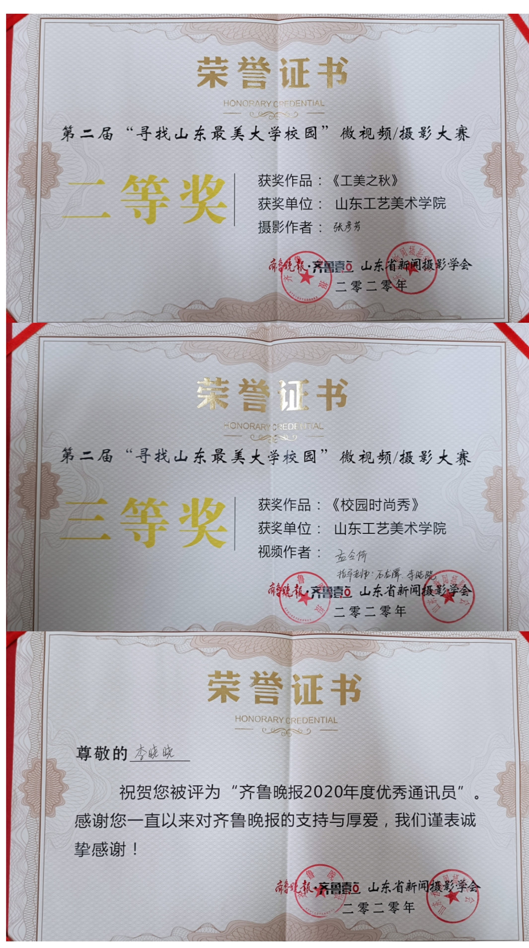 本次会议还对历时两个月的微视频摄影大赛做出总结评优。学校获得“优秀组织奖”。党委宣传部李晓晓获得“齐鲁晚报2020年度优秀通讯员”称号。永利官网数字艺术与传媒学院张彦芳作品《工美之秋》获得摄影类二等奖。人文艺术学院孟令倚作品《校园时尚秀》获得微视频类三等奖。