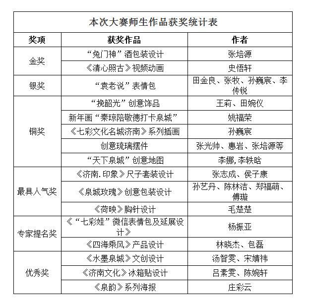 由济南市文化和旅游局主办,济南市旅游联合会等单位承办的首届文旅创新创意大赛落下帷幕。永利官网师生在此次大赛中喜获佳绩,荣获金奖、银奖、铜奖、最具人气奖、专家提名奖等多个奖项。其中,《“兔门神”酒》包装设计和《清心照古》动画作品获得金奖,《袁老说》表情包获得银奖,《挽韶光》创意饰品、新年画《秦琼陪敬德打卡泉城》、《七彩文化名城济南》系列插画、《天下泉城》创意地图等获得铜奖。《济南.印象》尺子套装等三件(套)作品获得最具人气奖,《“七彩娃”微信表情包及延展设计》等两件(套)作品获得专家提名奖。宋晓军、牟堂娟、王博三位老师获评优秀文创导师。yl8cc永利官网被授予“文旅创新创意工作站”。
