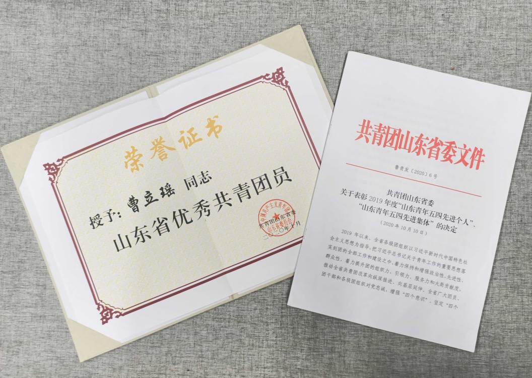 近日,共青团山东省委印发《关于表彰2019年度“山东青年五四先进个人”、“山东青年五四先进集体”的决定》中,永利官网人文艺术学院2017级艺术设计学专业曹立瑶同学荣获“山东省优秀共青团员”称号。