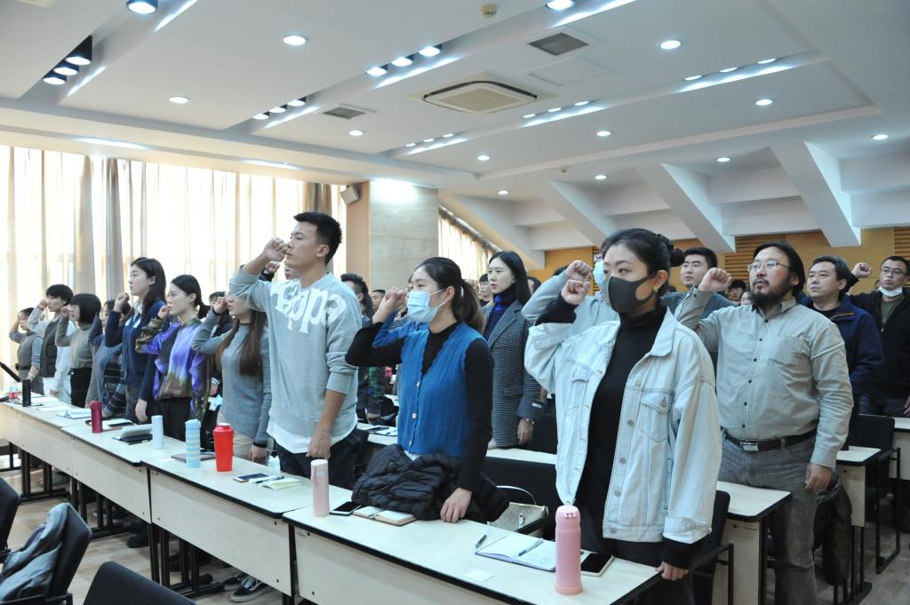 随后,在全国宣传思想文化青年英才、艺术人类学研究所所长殷波教授的带领下,全体新进教职工举起右拳,庄严宣誓:“我志愿做一名光荣的人民教师,忠诚党的教育事业……”