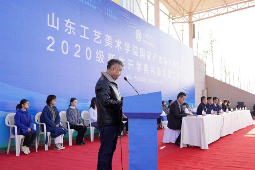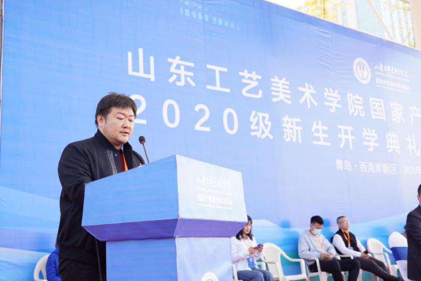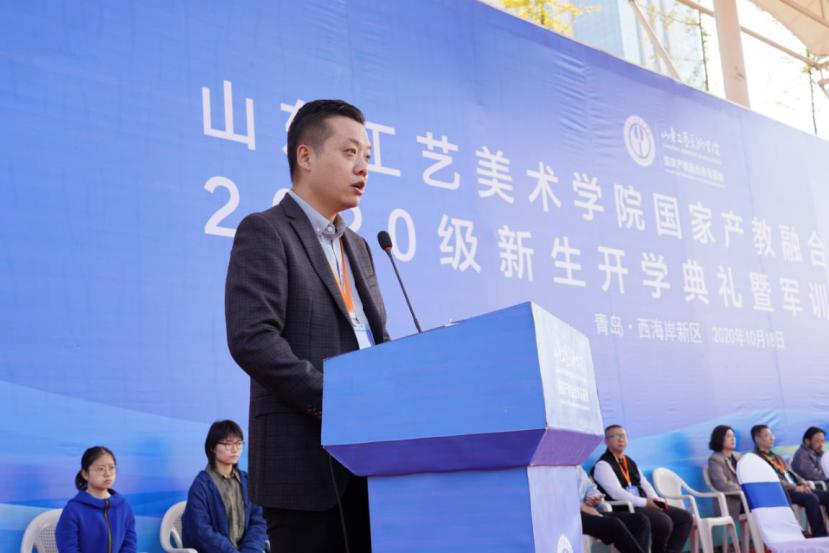 韩文涛代表学校讲话,提出几点希望与新生们共勉:一是要深植家国情怀。希望同学们坚守对艺术的追求和理想,树立远大志向,把个人的成长融入国家和民族的发展,将社会主义核心价值观根植于内心,心系民生,关注社会,服务国家,引领未来,以饱满的学习热情和崭新的面貌、干劲,喜迎明年的“建党100周年”庆典。二是要练就过硬本领。产教融合青岛基地的建设,是学校跨越发展的重要里程碑,希望同学们抓住学习的黄金时期,努力读书、刻苦学习,提升科学知识和人文素养;在学习中增长知识、锤炼品格,在实践中增长才干、练就本领,努力成为掌握真才实学的栋梁之才,为青岛、为西海岸社会经济文化发展助力。三是要勇担社会责任。学校领导老师对青岛基地首届学生,寄予厚望。希望所有同学秉承“天工开物,匠心独运”的校训,以“为人民而设计”为己任,紧密依托青岛基地产教融合优势,开拓创新,把成长的根基打得更牢、扎得更深,努力成为有信仰、有情怀、有担当、能奉献的艺术设计人才。
