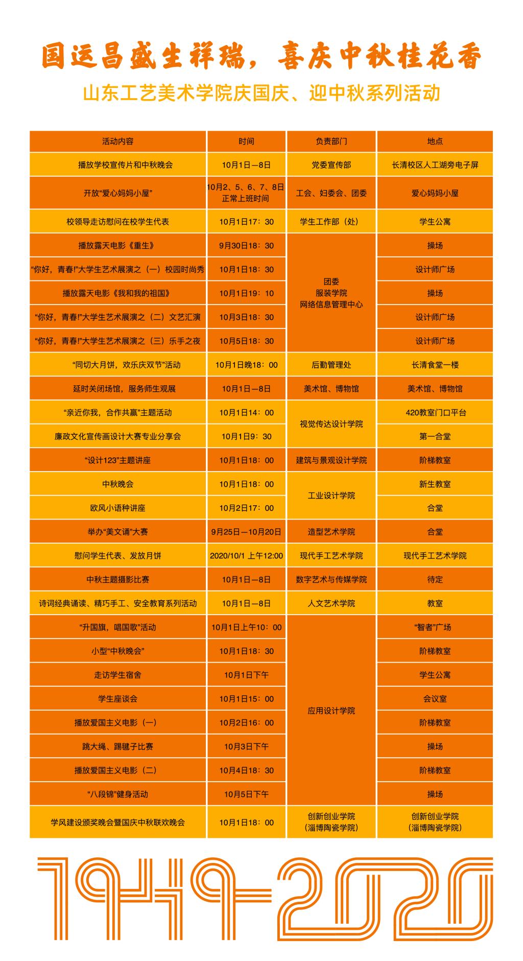 时维九月,序属金秋。为热烈庆祝中华人民共和国成立71周年,喜迎中秋佳节的来临,进一步激发师生爱国情怀、弘扬中华优秀传统文化,丰富师生校园文化生活,活跃“两节”氛围,结合学校实际,特开展“庆国庆 迎中秋”系列主题活动,欢迎广大师生踊跃参加!