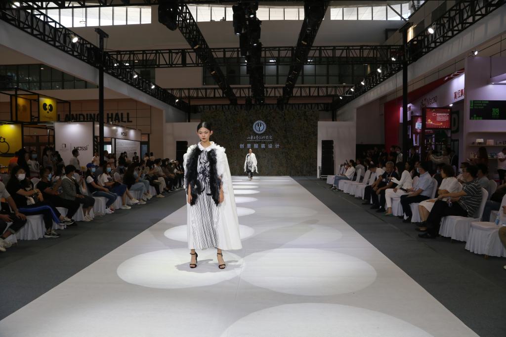 其中,创意服装展示了合作推介优秀毕业生作品和产教融合两个板块。优秀毕业生作品约30套,包含了传统创新、时尚前瞻等设计方向作品;产教融合板块展示舒朗集团Inspiration大衣外套系列、烟台旗源有限公司旗袍设计款、嘉兴锦裳时装有限公司Genial人造环保皮草系列服饰,三个系列产品均为服装学院与企业共同合作的成果。创意服装分别从面料染色、传统刺绣、传统拼布、传统服装结构等方面对中国传统符号进行解构重组,汲取和运用传统元素,在基于设计手法的转换和时尚概念运用的同时,与产业企业充分融合,了解消费与市场需求进行成果转化,实现了技术与艺术的紧密结合。