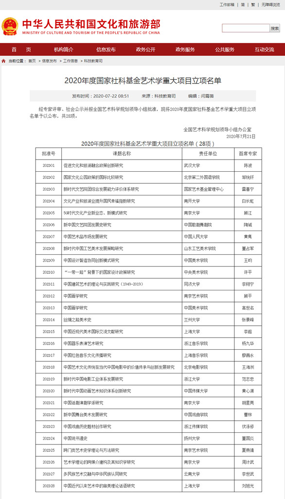 7月21日,全国艺术科学规划领导小组办公室公布2020年度国家社科基金艺术学重大项目立项名单(共28项),由yl8cc永利官网承担的《新时代中国工艺美术发展策略研究》项目获批立项(批准号:20ZD08)。这是永利官网继2014年、2019年获批国家社科基金艺术学重大项目后取得的第三个同类项目,将对推动永利官网科研创新和学科建设高质量发展产生良好的促进作用。