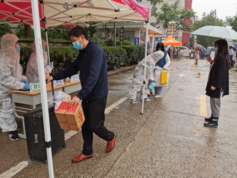 接下来,学生在工作人员的引领下进入宿舍区域,在宿舍门口再次接受红外线体温检测,检测正常后,方可进入宿舍。进入宿舍后,附中教师指引学生按照预先指定的床位,有序收拾行李。