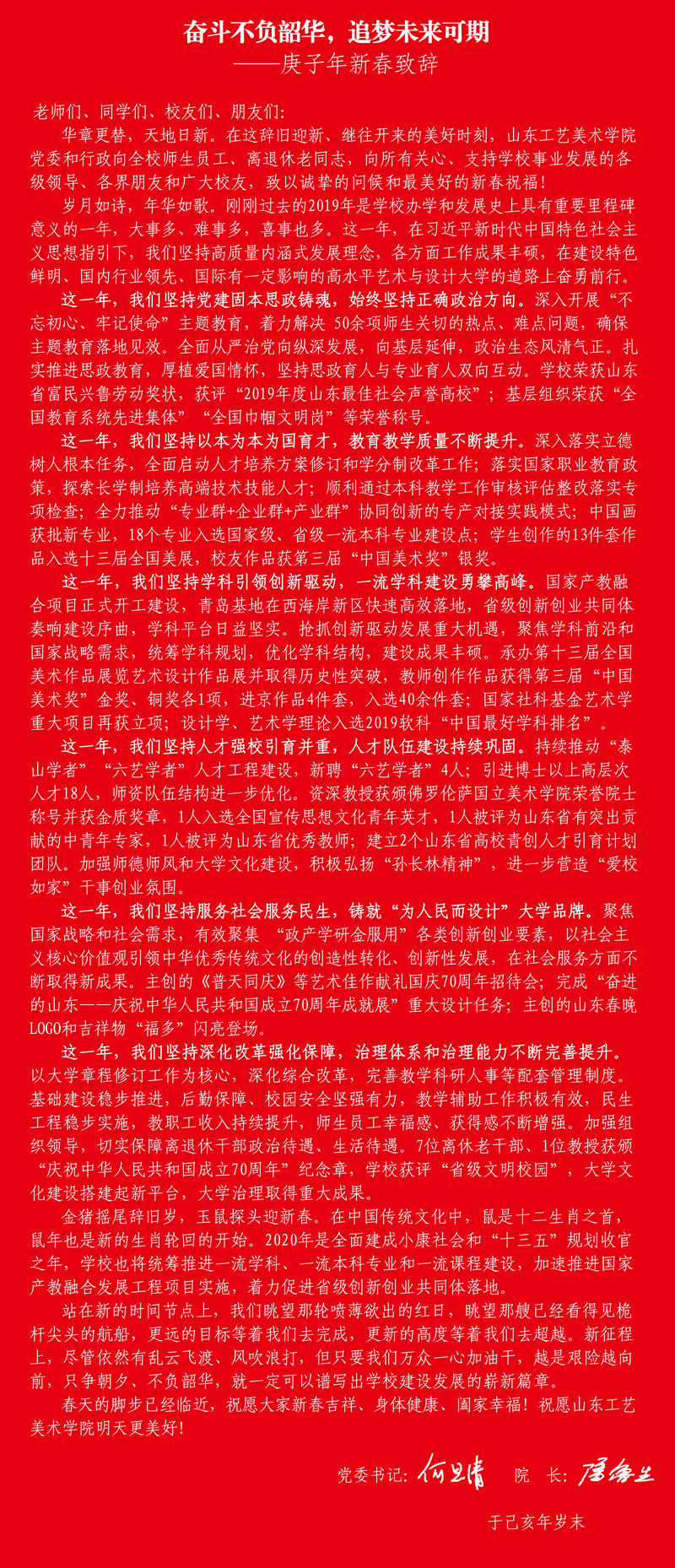 党委书记何思清、院长潘鲁生发表2020年新春致辞