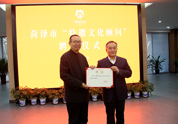 李新、鲁志成代表双方签署战略合作框架协议;陈强向潘鲁生颁发菏泽市“特邀文化顾问”聘书。