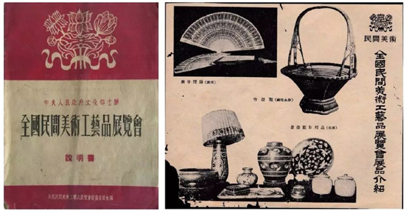 1953年由文化部主办的“全国民间美术工艺品展览会”说明书及宣传画。该展览是新中国建立之初举办的第一次规格最高、规模最大的国家级工艺美术作品展。