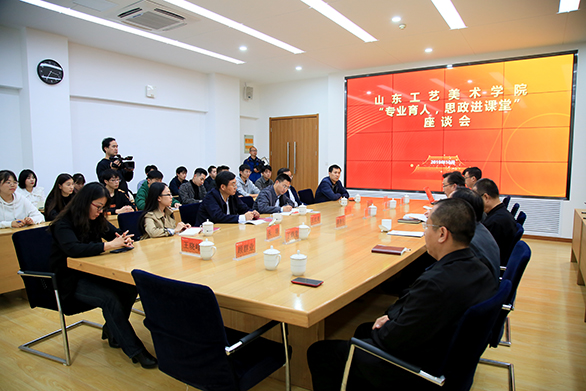 韩流一行在何思清、潘鲁生的陪同下,来到课堂,听取了视觉传达设计学院张瑞老师讲述的“专业育人,思政进课堂”的课程。在随后召开的 “专业育人,思政进课堂”座谈会上,何思清代表学校从坚持思政课程与专业课程同频共振、实践创作与思政教育相互融合、传统文化与当代价值有机统一三方面介绍了学校思想政治工作情况。何思清表示,学校坚持立德树人根本任务,坚持“以特色求发展”的办学思路,努力形成全员、全过程、全方位育人格局,在专业育人与思政育人相融合方面进行了积极探索,并取得一定成效。今后,学校将以提升教师育德能力和育德意识为重点,进一步加强教师队伍建设,积极寻求建立传统与当代的联系,加快推进艺术院校思政教材体系建设,逐步完善符合思政课建设规律的运行机制、考评机制,确保“三全”育人工作落实见效。数字艺术与传媒学院副教授张光帅就如何将社会主义核心价值观和思政育人工作融入专业课程教学做了汇报交流。
