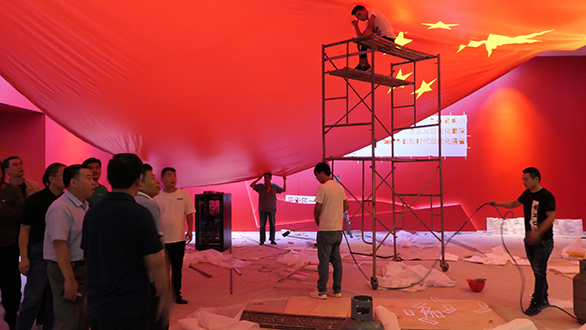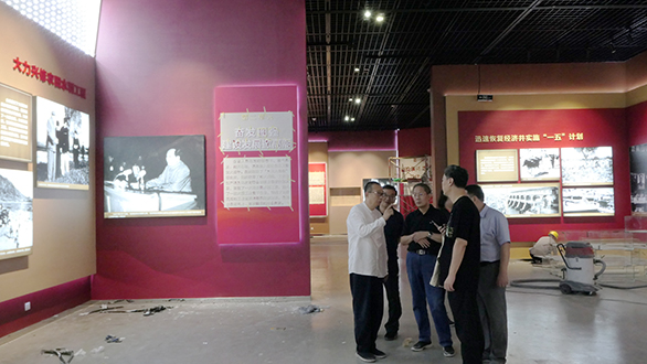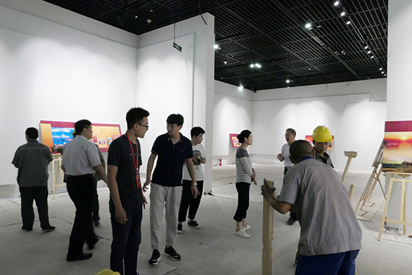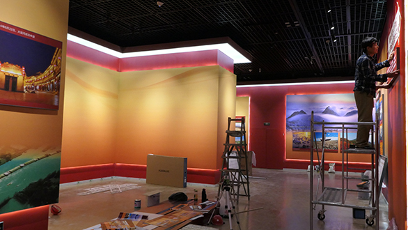 对于整个成就展来说,灯光的调试尤为重要。有效的灯光能更好的烘托展览氛围,让观者沉浸其中、流连忘返。但是在布展过程中,为了保障基本的用电安全,各线路的布局也必须分别设置成顶部、展墙和展柜等独立线路,繁重的工作量给整个展览的灯光调试带来很大的难度。施工人员面对困难,没有抱怨、没有退缩,针对每个展区的不同情况重点攻破。特别是在摆放物件的展柜灯光处理上更为用心,为了让灯光能够准确的照射展品,灯光安装人员对不同大小、不同形状的百余间展品,进行针对性灯光调试,确保灯光能有效的照射到展品上。