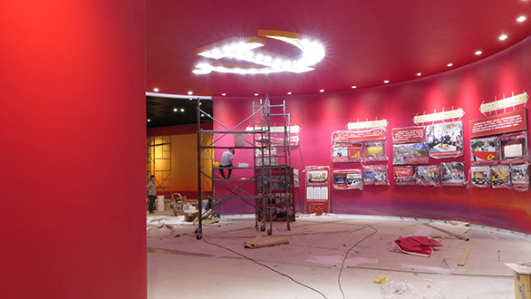 在展馆展示空间上,对施工管理也提出了新的要求。由于此次展览展示面积庞大,动线规划尤其显得更加重要。为了避免参观者在观展过程中产生空间视觉疲劳,设计施工方在第三展区设置一个圆形展示空间,参观者由常规的参观通道进入圆形展区,视角突变,视线豁然开朗。在展馆造型上,圆形展厅采用大篇幅、大色块的设计语言,使“新时代”主题特征更加鲜明突出,使参观者在心境上产生昂扬振奋的情感共鸣。