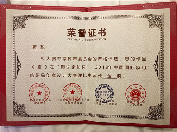 8月24日,2019"海宁家纺杯"中国国际家用纺织品创意设计大赛圆满结束,并在浙江海宁市举办颁奖典礼。大赛由中国家用纺织品行业协会、中国国际贸易促进委员会纺织行业分会、法兰克福展览(香港)有限公司、浙江省海宁市人民政府联合主办,中国家用纺织品行业协会设计师分会、海宁市许村镇人民政府承办、海宁中国家纺城股份有限公司、海宁市家用纺织品行业协会、海宁市许村镇时尚产业新生代联合会共同协办。