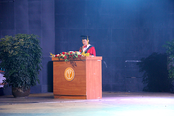 毕业生家长代表王茂梅发言。她代表全体毕业生家长感谢学校对孩子们的培养,向圆满完成学业,迈入人生新起点的孩子们表示热烈的祝贺。孩子的成长离不开国家、学校和老师的培养,国家的繁荣昌盛让孩子们能接受如此好的高等教育,学校深厚的文化底蕴良好的校风学风让孩子们成才,老师们的谆谆教导和良苦用心引领孩子们成长成熟。希望孩子们在以后的社会生活中,坚守美好的品德,热爱祖国、树立理想、服务社会、报效国家。
