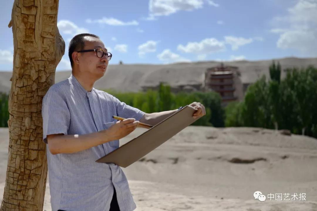 潘鲁生在敦煌莫高窟外写生