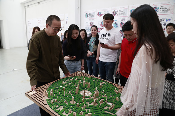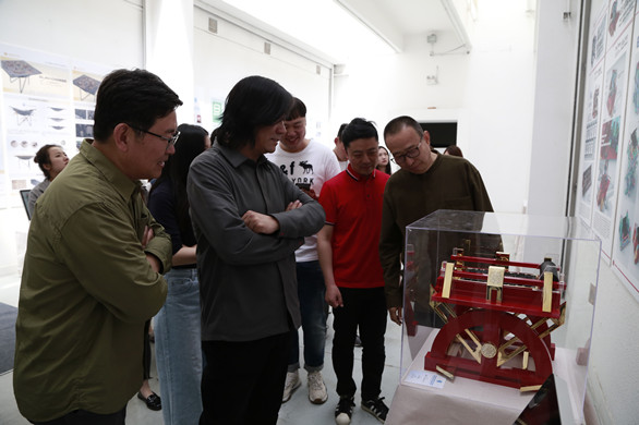 之后潘鲁生参观了设计类作品,在给予学生们高度肯定的同时,他提到:设计作品要注重引领当下生活和设计潮流,体现研究性,还要吻合前沿生活,提升生活品质。除此之外,成熟完美的设计要注重呈现形式多样性。在参观工业设计产品时,潘鲁生强调要关注当下的产品类型,不能局限于材质和种类,作品必须摆脱传统观念的束缚,既体现归纳观又要体现材料的顺应自然性和原生态美。