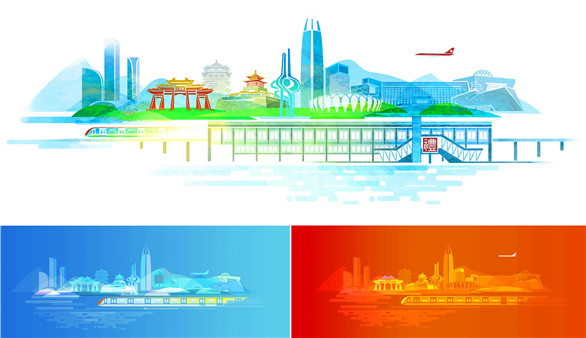 在辅助插画中的方向性的设定,画面从左至右,也就是说“从西到东”分别撷取了山东省会大剧院、大明湖牌坊、超然楼、解放阁、泉标、绿地普利中心、轨道集团总部大楼、奥体中心、龙奥大厦、山东博物馆、山东美术馆等典型地标;建筑物背景为千佛山;画面下部水纹象征济南七十二泉与大明湖。插图中部为济南轨道交通高架站,一组列车飞驰而过、贯穿东西,象征新时代、新动能、新交通,引领济南城市新发展。轨道交通为城市带来巨大出行便利的同时,也极大的促进了城市经济文化的发展,是城市的交通线、财富线,文化线。