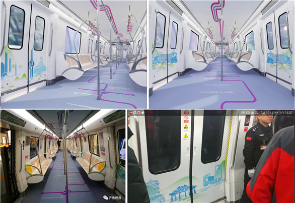 济南地铁首次通车仪式上使用的是四节车厢编组列车,设计团队沿着“新时代、新动能、新交通、新泉城”依次递进的四个主题相应展开设计。主要体现了济南的城市特征与济南轨道交通发展大事记。车厢地面铺装采用连续线条,将济南轨道交通的重要节点连贯起来,让市民乘坐地铁的同时,深度了解济南地铁发展过程,体会轨道交通集团所付出的巨大努力。车厢侧面的涂装,基本上还是延续了VI系统插画设计基本元素,体现城市特征。