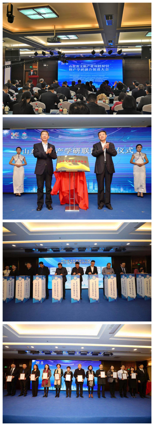 本次大会邀请国内知名文旅专家,高等院校、重点企业集团、重点高端会展旅游采购商及山东省和济南市重点旅游区县负责人齐聚济南,共商山东文化旅游发展大计。山东省文旅产业双招双引暨产学研融合促进大会开幕式正式举行,本次大会整合产学研各方资源,省内外重点文旅企业、山东省重点高校、山东省重点旅游区县,共61家单位集体签约文旅产学研促进战略合作。永利官网艺术与设计实践教学中心签约加入山东文旅产学研联盟,并入选首批“山东省文旅产学研促进基地”,实践教学中心主任张伟教授入选首批“山东省文旅产学研促进导师”。