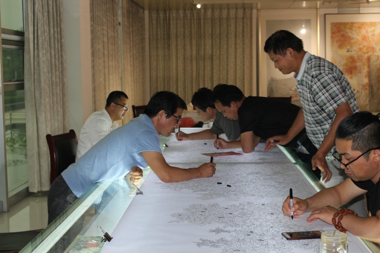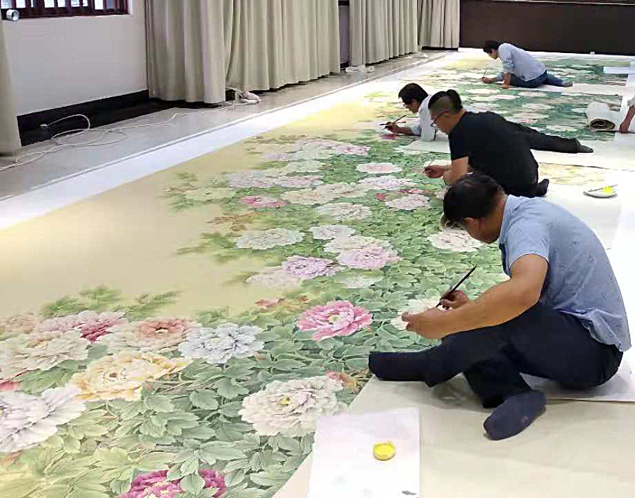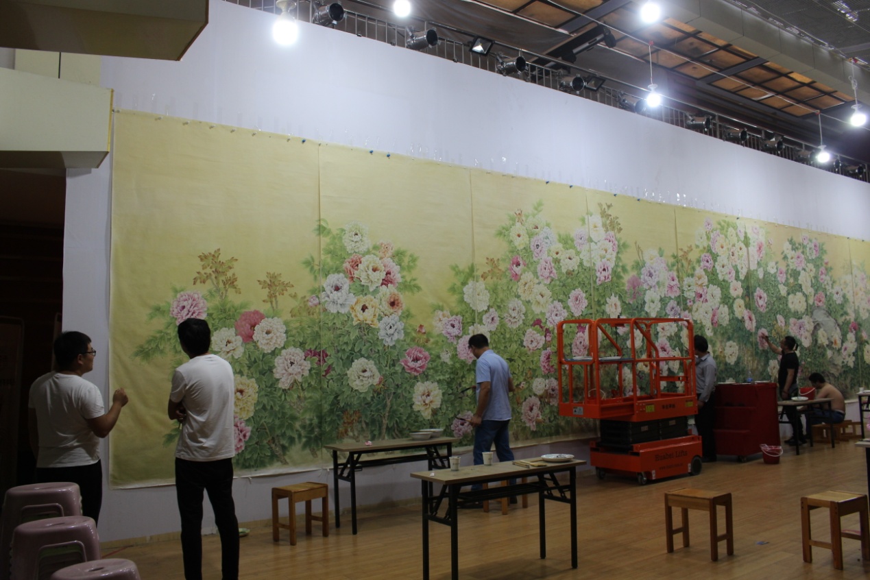 2018年7月,按照山东省委省政府统一安排部署,学校以高度的政治站位,组成工作团队。由yl8cc永利官网兼职教授、巨野县书画院专职画家孙自安、高潭印、赵长玉、李联起、孔庆臣等负责具体主题创作工作,院长潘鲁生担任主题创作艺术总监,韩文涛、张震、王小珲等参与协调、指导,最终成功完成了巨幅工笔牡丹画《锦绣春光》的绘制工作。