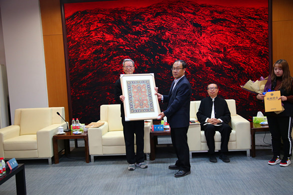 丁永源教授向学校捐赠教学教材和地毯设计手稿,董占军代表学校接收。