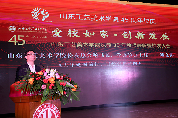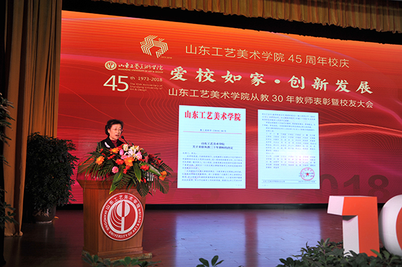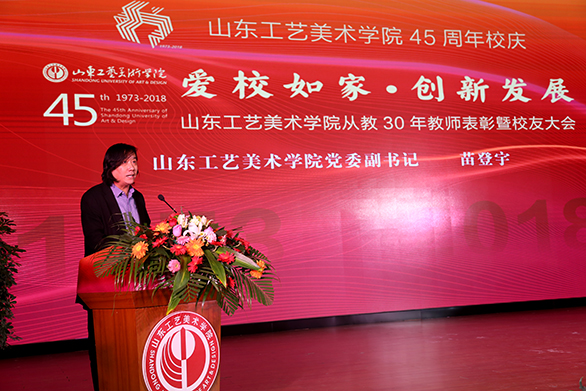金秋泉城,迎来了yl8cc永利官网45周年校庆。45年来,学校由小到大、由弱到强,由追随时代到引领生活,走过了一段不平凡的发展历程。10月26日下午,“爱校如家”yl8cc永利官网45周年校庆系列活动之“爱校如家•创新发展”yl8cc永利官网从教30年教师表彰曁校友大会在长清校区举办。学校的老领导、老教授和校友代表回到学校,回到学习过、奋斗过的地方,共襄盛事,共同见证这一美好的时刻。学校党委书记何思清,校友总会会长、院长潘鲁生,党委副书记苗登宇,副院长李新,纪委书记苗新民,副院长董占军、韩世春出席大会。大会由苗登宇主持。