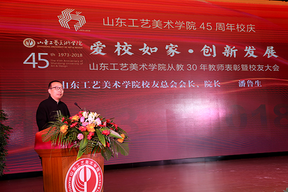 潘鲁生致辞。他代表学校向长期关心工艺美院建设发展的朋友们表示感谢,向在祖国各地勤奋工作、为母校赢得荣誉的广大校友们致以问候,向一直以来兢兢业业、辛勤耕耘的全体教职员工致以节日祝福。潘鲁生表示,峥嵘岁月,抚今追昔。工艺美院的45年,是一段艰苦创业的奋斗历程,是一段匠心文脉的传承历程,是爱校如家的建设历程。