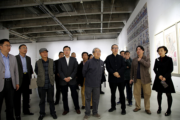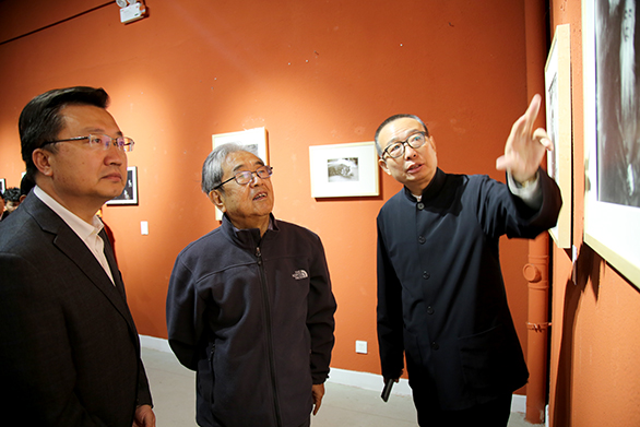 党委书记何思清、院长潘鲁生与老教授郭志光参观展览