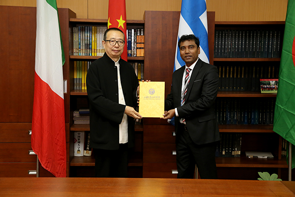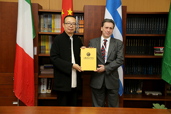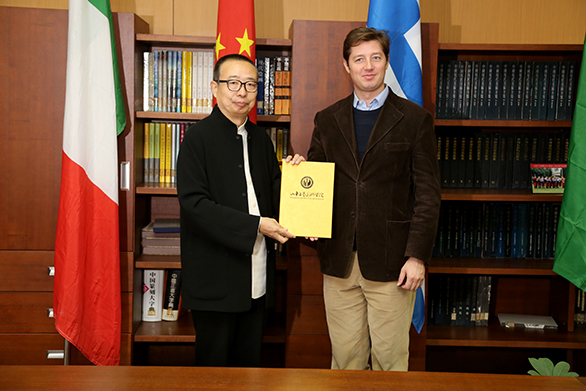 院长潘鲁生为意大利米兰文化中心主席、意大利米兰Eampus 大学教授马尔科•马里纳西颁发聘任证书