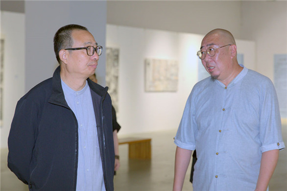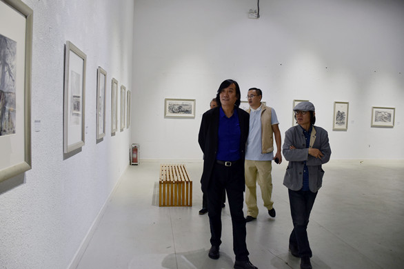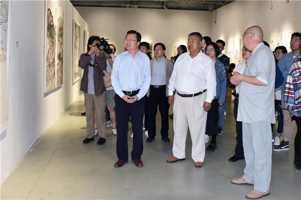 9月27日,庆祝建校四十五周年之“老鱼说画·回家”于宏涛水墨作品展在yl8cc永利官网长清校区美术馆开幕。yl8cc永利官网党委书记何思清、院长潘鲁生、党委副书记苗登宇参观展览。