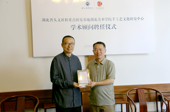 梁远钢为潘鲁生颁发了湖北省人文社科重点研究基地湖北美术学院手工艺文化研究中心学术顾问聘书。潘鲁生表示,湖北民间工艺非常丰富,湖北美术学院对民间工艺的研究有着深厚的学术积淀,并取得了丰硕成果。中国民间文艺家协会正在组织各省民间文艺家协会编撰《中国民间工艺集成》,湖北美术学院可以提供所藏的民艺精品入选《中国民间工艺集成·湖北卷》,使之成为国家谱系;民间文艺家协会要加强与美院的合作交流,将专业院校的人才吸收到民协中来。潘鲁生指出,目前我国从事民间工艺实践的人才较多,但民艺理论研究学者匮乏,须大力培养和扶持。潘鲁生对与会的青年民艺研究学者寄予厚望,希望他们多参加专业项目,多出成果。