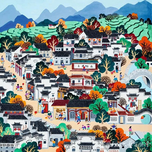 应该说,乡土生活改变,农民画创作者、接受者的生活体验,主办方诉求等多种因素发生了变化,但农民画中最本质的昂扬向上的生活状态、对美好生活的向往与追求、对劳动对耕耘对收获的歌颂,是任何时代都需要的,是民间的价值观诠释和表达,在今天仍然具有生命力。所以,我们需要认识今天农民画的现状,分析和把握其中的变与不变,了解农民画创作群体的心态和生活状态,把握农民画背后的新乡土生活。我们认为,农民画是乡村振兴战略中乡村公共文化服务体系的有机组成部分。在乡村文化建设中,发挥农民画在伦理教化、审美娱乐、人格培养、启蒙认知、情感交流、文化塑造等方面对人的培育作用,在启蒙教育、素质教育、专业教育、职业教育、社会培训、大众传习等方面形成多层次的教育传承体系,有助于培养提升人文素质。通过农民画的集体创作,达成群体性认同,形成整体性承传,也有助于深化文化凝聚力。同时,深入挖掘农民画蕴藏的民族精神、乡土精神,将农民画中的文化基因与当代文化相适应、与现代社会相协调,以民众喜闻乐见、具有广泛参与性的方式进行推广和传播,有助于筑牢中国传统文化价值体系。农民画是可贵的,以农民之手绘乡村之景、状乡村之情,岁月的长河里会有变迁,会有发展,但永远是我们走进乡村的艺术之门。