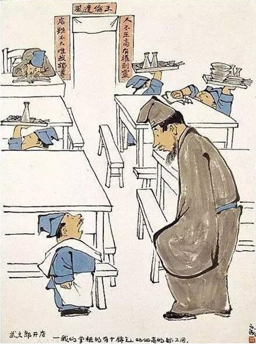 方成先生最广为人知的讽刺漫画作品当属《武大郎开店》。这幅作品创作于1979年,描绘的是武大郎饭店的情形。一位客人光顾饭店,看到跑堂的伙计都是矮个子,甚是不解,便找来一个伙计询问。伙计回答,“我们掌柜的有个脾气,比他高的都不用。”店面有一副对联“人不在高有权则灵,店虽不大唯我独尊”。横批“王伦遗风”。这幅作品借古讽今,形象地批评了当时“嫉贤妒能”的社会现象。《武大郎开店》在《工人日报》和《人民日报》相继发表后,方老每天都会收到很多读者来信,足见这幅作品在当时所引发的社会共鸣度之强烈。