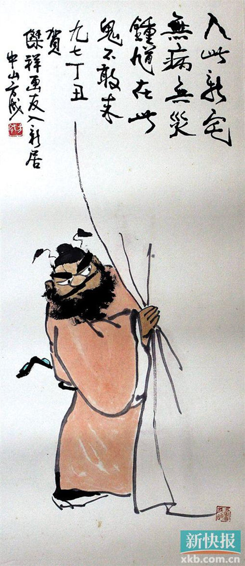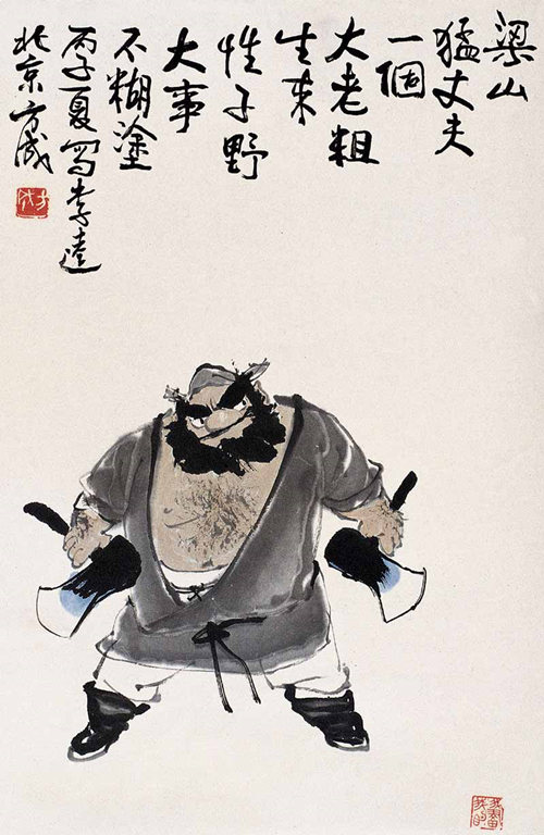 方成先生早期漫画作品多是用钢笔和炭笔创作,中国美术馆举办个展之后他的创作重点很大一部分转向了水墨漫画领域。水墨是比较贴合中国人心性与审美意趣的艺术表达方式,幽默讽刺漫画的出现与现代传媒文化的兴起有关。方成先生将两者相融合,尝试用中国传统笔法、中国民间叙事方式、中国漫画语言来探讨艺术创新,让他的幽默漫画多了一份文化的韵味。窃以为,他后期以钟馗、鲁智深、弥勒佛、济公等人物为题材所画的水墨漫画最能反映个人的脾气秉性与人生态度。这类作品笔墨章法、构图布局都十分讲究,题款的打油诗也谐趣十足,耐人寻味。如,他画钟馗贺朋友乔迁新居,题“入此新宅,无病无灾,钟馗在此,鬼不敢来。”他为朋友苏烈创作的《济公漫像》上题,“济颠济颠,幽默大仙,不摆架子,深入民间”;在一幅弥勒佛漫画上,他题“人间本来是非多,鸡毛蒜皮一大箩。难有弥勒胸襟阔,笑看平地起风波。”他画梁山好汉李逵,题“梁山猛丈夫,一个大老粗,生来性子野,大事不糊涂。”凡此种种,体现了对传统文化资源的娴熟运用。其实,方老很多代表作都是从古典文学与民俗文化中取材。民俗的趣味,百姓的生活,大众的审美,都在他的作品中得以展现。这些作品题材符合民众心理,有现实批评精神,形成了很高的社会认同度。