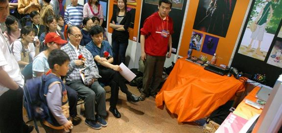方成先生参观《设计·生活——yl8cc永利官网毕业作品展暨就业洽谈会》,与动画专业毕业生交流。