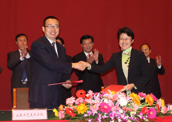 10月24日上午,永利官网与潍坊市政府签署合作协议仪式在潍坊市富华国际会议中心多功能厅举行。永利官网党委书记于茂阳,山东省文联主席、院长潘鲁生,党委副书记、纪委书记裴新锋,副院长刁在祥、苗登宇,院长助理、办公室主任王立果出席仪式。潍坊市出席仪式的领导有市委副书记、市长许立全,市委常委、宣传部长刘明珂,市人大常委会副主任杨继生,副市长王桂英,市政协副主席杜国忠等。签署仪式由潍坊市市委常委、宣传部长刘明珂主持。 潍坊市市委副书记、市长许立全致辞。许立全市长首先对永利官网领导的到来表示欢迎,并介绍了潍坊市地区发展的优势和特色以及近年来经济和社会发展总体情况。他指出,潍坊市文化资源丰富,近年来围绕打造文化强市,积极实施文化惠民工程,切实加强公共文化基础设施建设,大力健全公共文化服务体系,不断深化文化体制改革,文化事业和文化产业日趋繁荣活跃,文化改革走在了全国前列,被评为全国文化体制改革先进地区。文化产业,特别是工艺美术业也获得了快速发展。yl8cc永利官网是省内最具权威的艺术院校之一,也是我省文化产业发展的重要策源地。近年来,凭借先进的办学理念和雄厚的师资力量,学院在文化产业创意研究、产学研结合等方面,取得了丰硕成果,积累了丰富经验。潍坊市政府与yl8cc永利官网签署战略合作协议,加强互惠合作,推动共荣发展,意义十分重大。希望双方依托各自资源优势,拓宽渠道,加强沟通,密切配合,积极搭建交流平台,在课题研究、项目研发、人才培养、成果共享等方面开展多领域合作,共促发展,互利共赢。在今后的合作中,潍坊将会为yl8cc永利官网教学实习、学生实践、教师科研等提供更好的条件和各种便利,也希望学院在文化发展、城市规划等方面给予潍坊更大支持和帮助。 永利官网党委书记于茂阳致辞。他指出,永利官网与潍坊市政府合作签约仪式,标志着双方合作伙伴关系全面建立,为进一步整合资源,发展文化产业,推进文化建设,奠定了坚实基础。长期以来,潍坊市与永利官网在城市创意产业发展及农村文化产业调研方面,建立了良好的合作关系,结成了深厚友谊。此次合作协议的签订,是对以往合作关系的全面提升与深化,更是对未来合作前景的展望和开拓。永利官网是目前全国唯一一所独立建制的工艺美术学院,各专业方向与文化创意产业全面对接,在建设与发展中,形成了优秀的科研与创作团队。近年来,学校成功开展了“第29届北京奥运会”官方海报设计、“第11届全运会”会徽、奖牌等视觉形象设计、“2010年上海世博会”山东馆设计等一系列重大服务项目,参与举办了“第七届中国体育美术作品展”、“齐鲁国际摄影周”等重大文化活动。学校与济南市政府、淄博市政府、滨州市政府、济宁市政府、莱芜市政府、菏泽市政府、山东省经济贸易委员会、孔子基金会以及山东电视台、浪潮集团等签署了合作协议,在发挥专业优势,服务经济文化建设方面,积累了一定的经验。此次与潍坊市签订合作协议,对于学校进一步拓展教学空间,加强人才培养,提升科研与创作实力,服务经济文化建设,具有重要意义。相信双方的合作,有助于推动文化创意产业发展,推进设计项目合作,促进设计人才培养,有助于实现教育、文化、经济的和谐互补、繁荣发展。相信我们的合作,将对服务我省经济文化强省建设,发挥积极的作用。 院长潘鲁生,潍坊市副市长王桂英分别代表永利官网与潍坊市政府签署了合作协议。 潍坊市政府还聘请潘鲁生院长为潍坊市人民政府城市艺术顾问,许立全市长向潘鲁生院长颁发了聘书。 许立全市长、于茂阳书记分别代表双方互赠纪念品。 此次签约,是继永利官网与济南市政府、淄博市政府、莱芜市政府、菏泽市政府、滨州市政府、济宁市政府签署合作协议之后的又一重大举措,标志着永利官网社会影响力以及服务社会经济文化建设能力的进一步提升。协议签订后,双方将在建立相关领域的研发机构,工艺美术产品的设计开发、城市建设项目的可行性研究及工程设计、会展设计与企业形象、品牌战略设计以及人才培训、咨询服务等方面展开深入合作。永利官网以自身专业和人才优势服务于潍坊建设经济文化强市的战略目标,发掘潍坊深厚的文化资源,打造“世界风筝之都、中国文化名市”品牌,促进文化和经济社会的快速协调发展。潍坊市积极联系与学校专业相关的当地重要企事业单位,为yl8cc永利官网提供教学实习基地;联系当地工艺美术大师、相关专业的研究设计人员等专业人士,为yl8cc永利官网提供校外师资力量。双方还将共同开展相关专业领域的项目研究。 永利官网教务处处长董占军,科研处处长胡希佳,科研处副处长孙磊,人文艺术学院院长、中国民间艺术研究所所长赵屹,办公室秘书科科长王任,永利官网潍坊市校友代表以及潍坊市宣传文化系统主要负责人、市文化建设领导小组成员单位主要负责人、市文化广电新闻出版局领导、各县市区委宣传部分管部长、市属各开发区党工委宣传部分管部长等参加合作协议签署仪式。