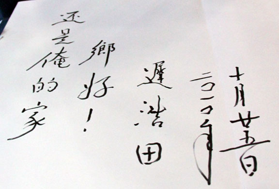 迟浩田来到山东馆前兴致很高地说:“到家乡馆了”。随后,他特别仔细地逐一观看了各展品、展项,详细了解了山东馆的建筑造型、设计理念和展示内容,饶有兴致地在孔子像前留影纪念,在中厅认真观看了影片,在尾厅拿起球拍体验了现代家庭体育互动活动,在休闲吧内品尝了张裕葡萄酒,并非常高兴地题写了:“还是俺的家乡好!”离开山东馆前,迟浩田对山东馆开放式的建筑创意、展示内涵和优质服务给予了高度评价,向山东馆现场工作人员致以亲切问候。运营团体负责人代表山东馆向迟浩田赠送了刻有山东馆图案和“齐鲁青未了”字样的锡雕工艺盘。