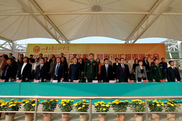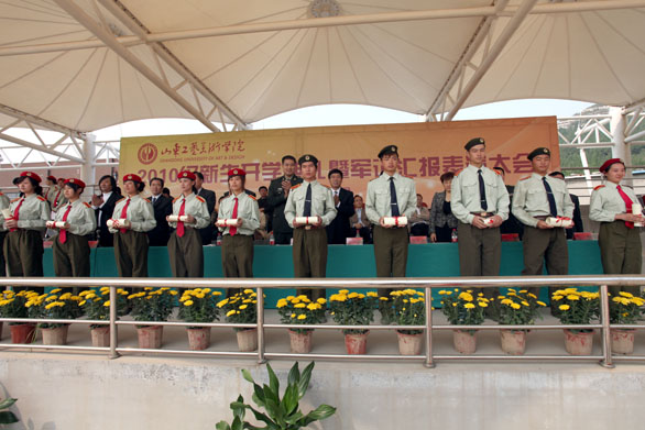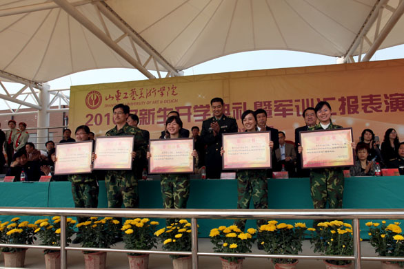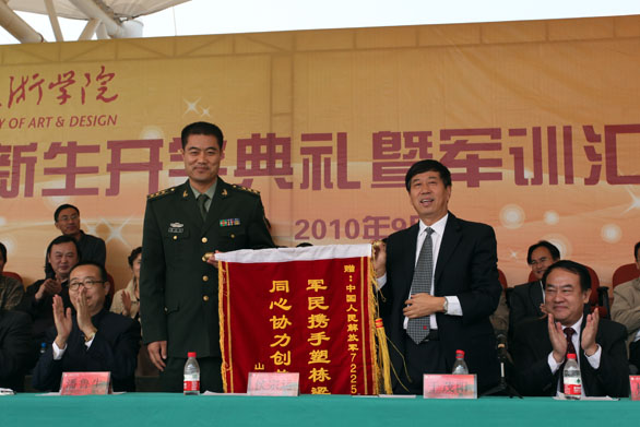9月29日上午,永利官网2010级新生开学典礼暨军训汇报表演在长清校区体育场举行。党委书记于茂阳,院长潘鲁生,党委副书记杨新力,党委副书记、纪委书记裴新锋,副院长李新、刁在祥、张云龙、苗登宇,院长助理、办公室主任王立果,中国人民解放军72253部队副政委侯宗运,国防教育办公室主任尹新出席典礼。典礼由副院长苗登宇主持。永利官网2010级新生参加了汇报表演。 在激昂的解放军进行曲中,永利官网2010级新生开学典礼暨军训汇报表演拉开了帷幕。院长潘鲁生检阅了全体参训新生。随后军训汇报表演正式开始。各方队伴着豪迈的乐曲声依次入场。齐步走、正步走,同学们步伐整齐、口号响亮,走出了美院人的神采,喊出了美院人的气势。威武雄壮的军体拳引来了全场的阵阵喝彩,整齐划一的旗语表演展现了美院女生的飒爽英姿。 汇报表演结束后,中国人民解放军72253部队副政委侯宗运讲话。侯宗运对永利官网2010级新生历时13天的军训获得圆满结束表示祝贺,他指出,通过军训,同学们提高了思想觉悟,磨炼了意志品质,激发了爱国热情。同时,增强了国防意识,掌握了基本军事知识和技能,综合素质得到全面提高。 副院长张云龙作军训工作总结报告。张云龙指出,作为大学生活的第一课,军训给同学们以多方面的教育和锻炼,为今后的学习工作打下了良好的基础。通过军训,同学们学习了人民军队的优良作风,增强了国防观念。磨练了意志,增强了体魄,增强了纪律观念和团队意识。希望同学们在即将开始的学习生活中,以本次军训为大学生活新起点,认真学习解放军同志的优良品格和作风,把学习作为大学生活的首要任务,自觉加强思想品德修养,树立远大的理想,正确规划自己的人生。 党委副书记杨新力宣读学校嘉奖决定和军训工作表彰决定。永利官网对军训团团长李健和各军训营营长通令嘉奖,对军训工作先进集体、军训优秀学员进行表彰。 大会上,学校领导向获得军训先进集体荣誉称号、军训优秀学员荣誉称号的单位和个人代表颁发奖状,向各位辛苦奋战的军训教官颁发荣誉证书。 党委书记于茂阳代表学校向济南军区坦克训练基地赠送了锦旗。 颁奖仪式结束后,教师代表孙大刚代表全体教师发言,他对新生的到来表示欢迎并提出希望,鼓励学生胸怀天下,学会思考,学会求知,学会做人。2010级学生姜闪代表全体新生发言,表示要在学校领导和老师的培养下,将把军训中的好传统、好作风、好习惯和好品质带到今后的学习和生活中去,努力学习,健康成长。 院长潘鲁生作重要讲话。潘鲁生首先代表校党委行政和全体师生员工,对承训部队解放军官兵表示衷心的感谢,对2010级新生表示诚挚的祝贺和热烈的欢迎。潘鲁生院长指出,在日趋激烈的全球化竞争中,艺术和设计直接关系国家的形象和文化实力,关系到经济发展和文化传承。作为工艺美院人,我们将共同迎接挑战,谱写设计艺术发展新的篇章。崭新的起点,光荣的使命。 在今天这特殊的日子里,作为师长,潘鲁生院长对新生们提出了殷切希望,他希望同学们在接下来的学习生活中志存高远,担当责任;勤奋学习,不断进取;勇于创新,追求卓越;身心健康,和谐发展。 最后,潘鲁生院长希望同学们珍惜宝贵的大学时光,认真学好每一门课程,用心创作每一件作品,珍惜每一次交流和实践的机会,积极开阔眼界,努力增长才干,不断锤炼意志,坚定理想和信念,谱写出人生最美好的大学乐章。 在2010级学生林乃菁的带领下,全体2010级新生进行了入学宣誓。 至此,永利官网2010级新生开学典礼暨军训汇报表演圆满结束。 参加本次典礼的还有学校有关部门、单位负责人和各二级学院院长、党总支书记、副院长、副书记等。