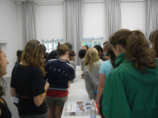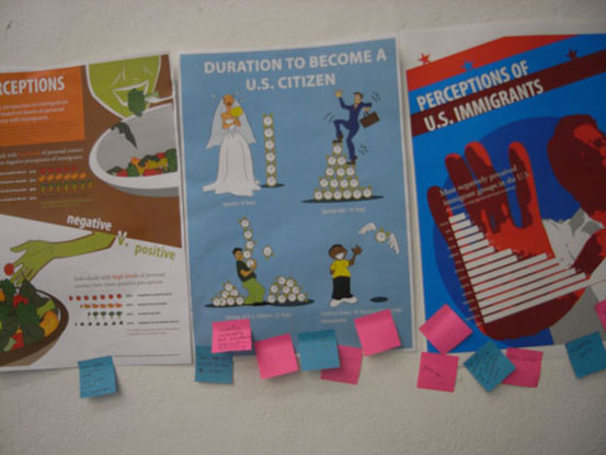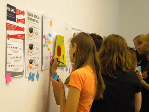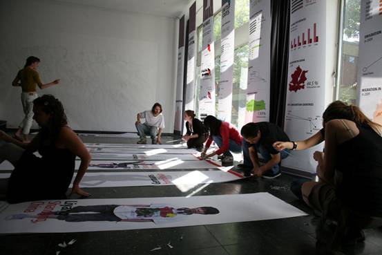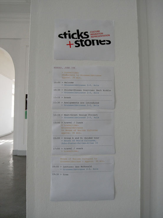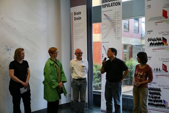 2010年6月,yl8cc永利官网视觉传达设计学院由石增泉院长带队的部分教师和学生赴德国参与“STICKS+STONES”国际交流活动。 6月8日是“STICKS+STONES”,国际合作课程课题境外深入阶段,围绕着“移民问题”继续深入展开。 中国、德国、美国、土耳其的四十多位学生以小组和混合交插的方式组成学习小组,两个不同国家的学生组成基本的学习交流单元,对话使用语言为英语,这对于使用汉语的中国学生是一个不小的挑战。不同国籍的学生背后不同的文化背景,不同的语言、不同的肤色以及意识形态的多样化,使得之间的交流与对话变得更具有意义,面对面的探知沟通是合作完成“STICKS+STONES”课题的第一步。学生之间的了解与对话是由浅入深的,从表面的印象到由地域、文化、习俗产生的“等级制度,交流、个性与集体主义”的差异,交流向深度发展。 《宣传》主题的讲座由美国马里兰大学的Audra Buck-Coleman教授主讲,Audra Buck-Coleman教授是本次国际课程的主要组织者和发起者,对移民问题文化的研究成为她近几年主要研究课题。讲座的主题依然关注的是移民问题,包括历史上美国对华人的排斥,德国对犹太人的歧视,瑞士和穆斯林的移民冲突等等。Audra Buck-Coleman教授提出了白色宣传、黑色宣传、灰色宣传的概念,并列举了大量的事例予以论证。柏林艺术大学的Ulrich Schwarz教授的《沿着客观性行走》的演讲,以一个实践者的身份详细介绍了一些设计案例。Ulrich Schwarz是柏林艺术大学的知名教授,研究的方向为视觉传达设计,近几年完成了大量的德国各类博物馆的设计,从项目规划到概念形成,具体实施的步骤和细节,完成了大量的设计项目,他的设计在德国有着很高的知名度。Ulrich Schwarz教授与他人合作在中国出版有著作《展览设计实用手册》。Ann McDonald《成功的以用户为中心的设计活动》、德籍华人刘杨的《东方与西方》、Charlotte Driessen《今日柏林设计》、Florian Hardwig《字体设计》等精彩报告也在项目过程中一一呈现。 本次合作课题非常重视客观事实的现场调研,让同学们认识到结论来源于对事实的研究分析,对柏林一个移民区的实际采访、调研则是对移民问题的一次重要调研体验。参观移民博物馆,由本地区的移民问题专家带领学生参观本区的街道、遗迹、居住区,了解现今移民的实际生活状况以及带来的各种社会问题,使学生亲身感受移民问题在当今社会产生的影响。移民生活的艰辛,文化冲突等一系列问题,移民成为一个民族、一个国家、每一位公民不可忽视的社会问题,这是一个广泛的,涉及宗教、民族、政治、文化的世界。柏林移民区的调研教学活动引发学生对这一问题深度思考,使学生的社会责任感、洞察社会的敏感度获得加强,思维方法的掌握,思考路径正确性也得到逐步提高,思辨、批判、认识问题的能力在这一教学环节中得到提升,这为下一步的课题完成积累了大量的感性与理性的素材。 德国教授的体验、交流类课程为感受人与人之间各种心理活动、心理行为搭建了一个生动的学习舞台,对何为文化的回答,中德行为图形的分析与感受,用肢体语言表达自己的要求,并让对方完成这些要求,距离感的舒适度感受,用英语语言自我介绍且每一个同学要叠加前一位同学的介绍传递下去,最后的一位同学要说出前面所有同学的姓名、爱好等等,确实难度不小,沟通与密切度的建立在同学们的行为中得到学习。研究人,研究人的行为、心理、情感是这一教学环节的主要目的。当我们知道如何去了解人,知道人的需求,那还有解决不了的设计问题吗?这应是对设计本质理解正确路径。 画对方的画像是一个有趣且难度不小的课题,尤其是对文化不同、外貌不同他国人物,它不是往常我们理解写生式外形描摩,是建立在几天的沟通了解、观察且对对方的文化背景、兴趣、言语、肢体、情感感受基础之上的符号寻找过程,同学们回到旅馆后挑灯夜战,约学习伙伴继续交谈,以便从对方身上获得更多的信息,找到最佳的表达语言与形式,准确的符号对位,新奇的观察角度与表现,是同学们在此环节中把我的重点。 接下来的教学活动是把学生分成五个小组,任务是:A组负责柏林当地移民的深入采访,要求有视频访谈;B组负责移民问题深入的信息整理和信息表达设计;C组负责展览的海报设计;D组的任务是通过互动行为的设计感知得到人们对移民的印象;E组则是在前面四个小组的成员中挑选出来的展览协调小组,负责整个“移民”主题展览的具体事宜。中国学生分别参加了C组和D组的任务。 各个小组的设计工作进入紧张的实际操作。A组多角度访谈了当地的土耳其移民并制作了视频文件;B组继续深入的调研了各类移民信息资料,并将数据进行整理分析,制作图表;C组的海报设计经历了几次变动,开始的题目是《对谬误广告宣传的重新设计》,要求小组成员每个人都找到一幅侵犯人权的有谬误的宣传广告,研究它指出广告的错误并有针对性的重新设计一幅相对应的广告,这个任务寻找一个有错误的广告作品是首要要完成的,同学们来到柏林的一个公共图书馆,查找资料(图书馆是柏林艺术大学、柏林工业大学的共用图书馆,图书馆的建设很精彩,藏书多,建筑好、看书的人多),稿子进行到一半时由于展览空间的问题这个停止了,转而设计四个国家的人行为特征研究,通常对一个国家人的印象