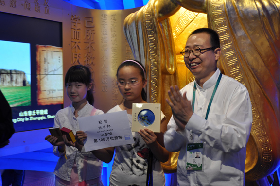 ,山东馆执行副馆长苗登宇,山东馆轮值副馆长王霞在山东馆举行了祝贺客流首超100万仪式。并祝贺成为2010年上海世博会山东馆第100万位游客,为陈思懿小朋友颁发了证书并赠送了山东馆纪念瓷盘、孔子像馆章、论语百句等纪念品。