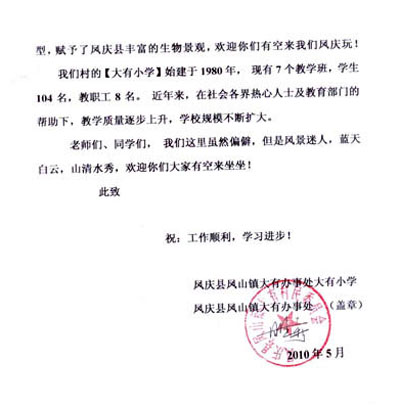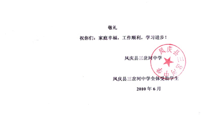 凤庆县凤山镇大有村办事处的党支部书记甘德新寄来的感谢信