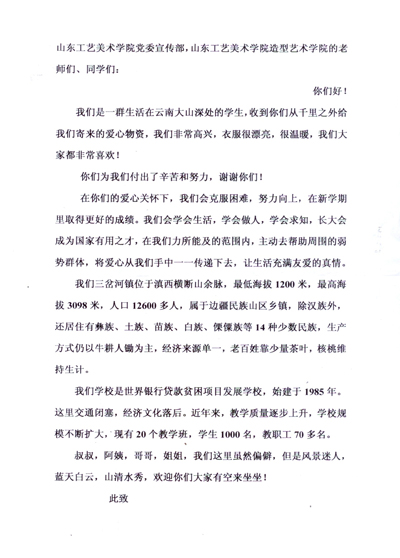 为发扬永利官网学子“奉献,友爱,互助”的志愿服务精神,激发当代大学生的社会责任感,为贫困山区的孩子们奉献一份爱心, 2010年5月10日——5月25日,yl8cc永利官网党委宣传部与造型艺术学院联合举办了“有爱就有希望”大型爱心募捐活动。 活动以“有爱就有希望”为亲情呼唤点,由校广播台和造型艺术学院学生会承办,旨在为贫困山区的孩子们提供一个健康快乐的精神家园,让他们感受到社会大家庭的温暖,帮助他们树立起战胜困难、勇敢面对生活的勇气。 在活动筹划阶段,我们借助广播、电视、海报、横幅等校内宣传媒介,做了大量的准备工作。大家自制募捐箱,手绘宣传小展板,录制宣传视频,联系义演节目……每一个小小的环节都倾注了我们很多心血,我们希望把准备工作做到尽善尽美,用实际行动唤起大家的爱心,唤起社会对弱势群体的关注。 功夫不负有心人。5月10日上午,我们早早的餐厅路口布置好募捐场地。活动一开始,便吸引了众多的同学前来参与。老师和同学们纷纷积极响应,踊跃参与,慷慨解囊。不仅本校师生员工积极参与,就连经过的路人看到展板上孩子们纯真的笑脸,也纷纷表达爱心。得知活动的消息,山东轻工业学院08级装饰绘画班的50名同学来到募捐现场,捐款捐物。5月10日晚上,一场自发的义演活动在募捐现场上演着,同学们用自己优美的舞姿和歌声传递着我们的爱心,传递着我们对山区孩子的祝福。 募捐活动中的一个个镜头让我们感动着:一位不愿意留下姓名的同学送来了自己心爱的吉他和乐谱;志愿者协会的同学们捐献了一台电视机;一位女同学递上她积攒了很久的一个满满的存钱罐;当天错过捐款的老师后来主动找到我们,让我们一定将迟到的祝福送给山区的孩子……还有一个“姐姐”写给孩子的信,信中这样写到:“孩子,姐希望你能坚强,困难不可怕,可怕的是逃避”。是的,困难不可怕,因为有我们千千万万人的努力,当悲伤倾尽,有我们众志成城;当泪尽血续,有我们守望相助。 活动有期,爱心无限。截止到5月11日晚上7点,我们共募捐到现款4507.1元,各类书籍233本、衣服1067件、裤子457条、鞋子155双、电视机一台等若干物品。 活动结束后,我们主动联系受助单位,争取在第一时间将善款和爱心物资寄出。但是由于受到自然、地理等条件的限制,我们无法将全部物资送往云南省临沧凤庆县。为了不辜负全校师生员工的真情和爱心,我们又积极联系济南市红十字会,就近选择支援单位。 5月18日,首批爱心物资发放活动正式启动。同学们冒着炎炎烈日,将一箱一箱、一捆一捆的书本、衣物装运上车,满满的两车物品代表着永利官网师生满满的爱心。包括1000余件衣物、鞋子以及上百本图书在内的物品由受到济南市长清区红十字会委托的长清区孝里镇教委接收,并统一发放给该地区贫困地区的学生。 5月20日,我们将募集到的4507.1元全部善款和爱心物资寄往云南省临沧凤庆县大友小学和三岔河中学,由当地教育部门工作人员为大友小学师生购得2台教学用的新电脑,并为三岔河中学的孩子们准备了若干六一礼物。 6月3日,我们收到了云南省凤庆县凤山镇大有村办事处的党支部书记甘德新和三岔河中学受助学生寄来的感谢信,在回信中甘书记表示,在大家的爱心关怀下,他们会克服困难,努力向上,会教育孩子学会生活,学会做人,学会求知。三岔河中学的孩子也在回信中写到千里之外寄来的爱心物资,他们非常喜欢,他们要在爱心的激励下,更加努力的学习,长大后成为国家的有用之才。在力所能及的范围内,主动去帮助周围的弱势群体,将爱心一一传递下去,让生活充满友爱和真情。 从活动策划到结束的一个月时间里,我们一次次的感动着也快乐着,为老师、同学们的爱心而感动,为贫困山区的孩子们的生活得到改善而快乐,爱心是不需要用任何言语来修饰的,行动更足以诠释它的内涵,而我们正是在用行动、用爱心之手去诠释着奉献的意义。后期,我们将通过广播、电视、海报等形式对募捐结果和物资使用情况进行公示,以此感谢全校师生对活动的支持,感谢你们的真情和爱心。 虽然我们的经济能力有限,但是只要有我们的爱心在,相信远方的孩子们一定能感受到来自老师和同学们的温暖。同播温情种,共筑爱心墙!我们相信只要人人都献出一点爱,世界将变成美好的人间!