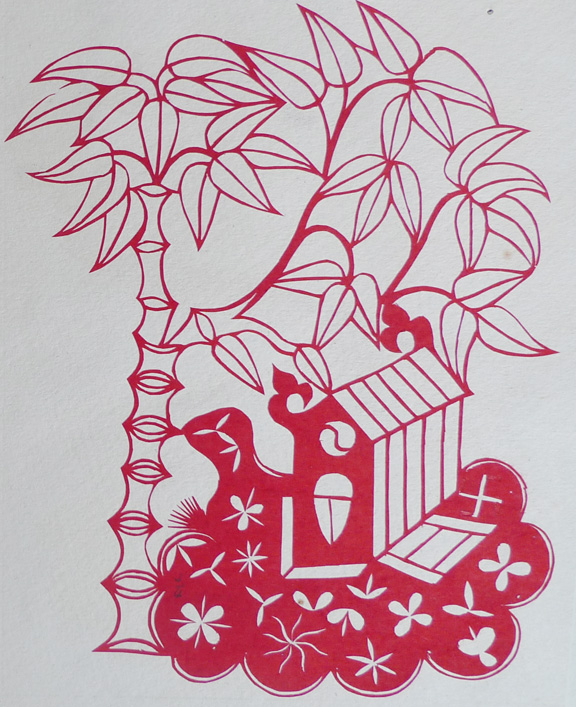 鲍家虎:毓璜顶是一座小山,那地方原来是个教会。教会传教士对山东的民间剪纸非常喜欢,在1920年代就成立了剪纸研究会和剪纸工厂,这在全国来说还是第一次。官方组织的山东省剪纸研究会成立的时候是在文革以后,1982年,整整差了半个世纪。传教士把西方的剪影式的剪纸和胶东的剪纸结合起来,完成了西方民间美术和东方的民间美术的一次交流、融合,并运用到实用品设计中,像书签、挂历、各个方面,纪念册、请柬等,各种产品形式都是用剪纸来设计。毓璜顶的剪纸在全国来说是独一无二的,得到了广泛流传。最初我们在不知道毓璜顶剪纸的情况之下,收集了很多这样的剪纸,以为是胶东的民间剪纸的又一种风格,但是就感觉很奇怪,后来经过实地调查才知道这是教会剪纸的影响。