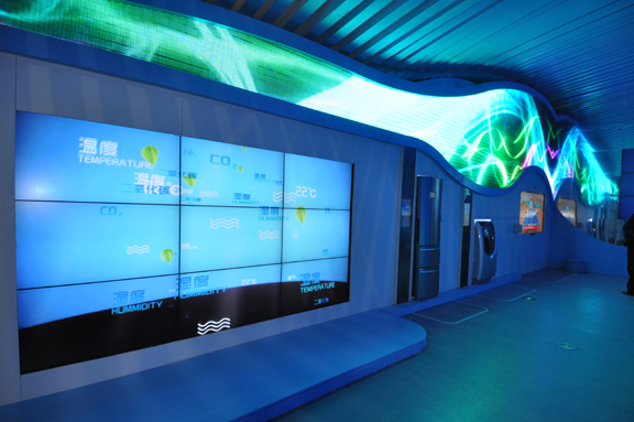 科技的“花如意”作为信息平台,展示物联网冰箱、无水或无洗衣粉洗衣机、无尾电视等先进低碳环保产品互动为契机,体验未来低碳城市新生活。将表演、影像、CG互动结合的一场约5分钟的“演示秀”,现场展示未来家庭如何使用物联网带来的高科技、轻松、健康、愉快的生活体验。