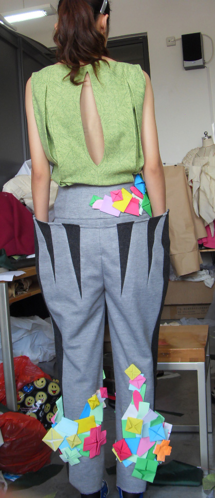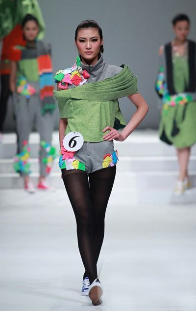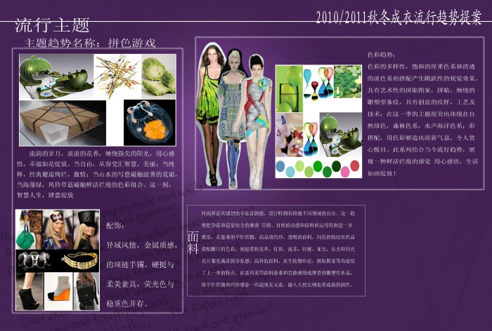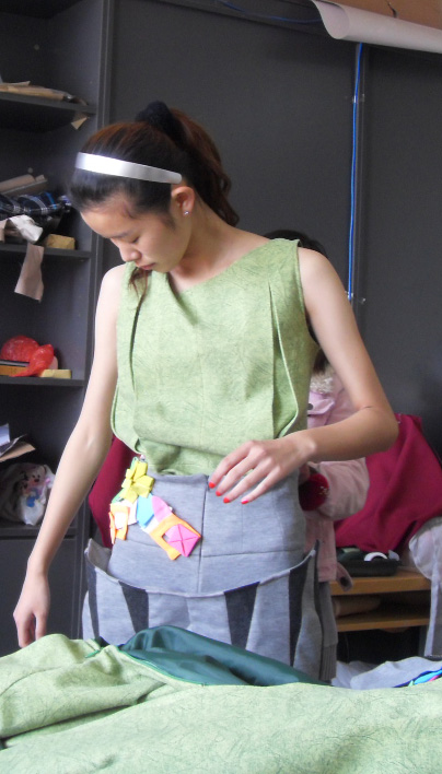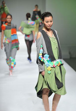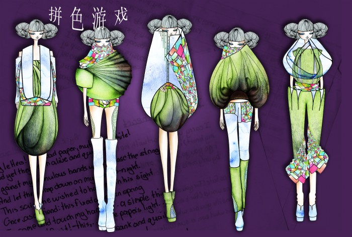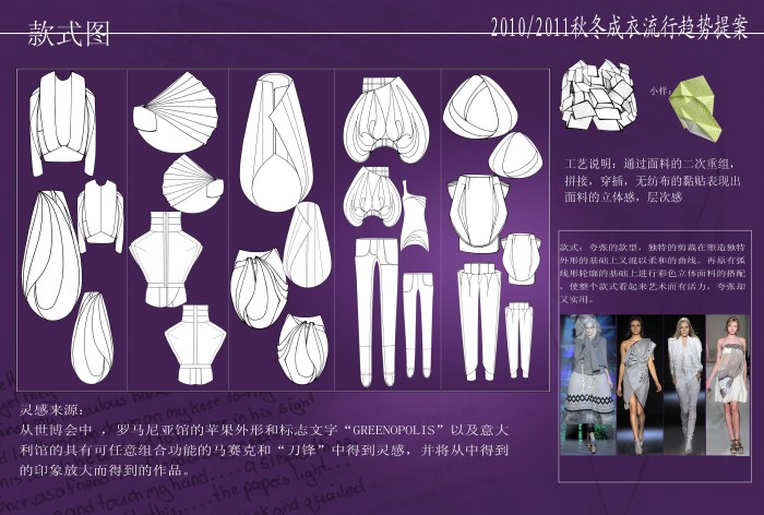此次比赛中王倩同学的设计作品灵感来源于世博会中,罗马尼亚馆的苹果外形和标志文字“GREENOPOLIS”以及意大利馆的具有可任意组合功能的马赛克和“刀锋”等。接到入围通知后,在第一工作室邹渊老师、顾振美老师的指导下,工作室内迅速组成了由王倩,李辉,李连辉的设计制作小组,在面对如此复杂的设计精神到物质转化的过程中,同学们攻克一个又一个技术难关,经过一个月的努力,王倩同学经过《2010/2011秋冬成衣流行趋势提案》、成衣作品展示、立体裁剪等三个部分的评比后,最终在比赛中获得优秀奖。