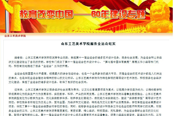 近日,新华网教育频道“教育改变中国——60年建设专题”在显著位置发布文章,详细报道永利官网服务全运会工作纪实。 文章以图文并茂的形式,全面展示了永利官网服务全运会的主要设计成果:会徽、吉祥物、宣传画、奖牌、圣火台、形象系统、志愿者标志、圣火采集仪式服装等,并详细报道了永利官网志愿者服务全运会工作情况。文章肯定地指出,学校积极发挥专业优势,承担第十一届全运会的诸多艺术设计任务,服务社会发展,为全运会和山东经济文化建设做出了自己的贡献。 近年来,永利官网作为特色鲜明的高等设计艺术院校,积极服务社会经济文化建设,承担了全运会的诸多设计任务,取得了良好的社会反响。对服务全运会的工作,学校领导高度重视,周密部署,精心组织,积极落实,无私奉献,为全运会奉献出自己的文化创意、聪明才智和劳动心血。学校专门成立了第十一届全运会艺术设计中心、“第七届中国体育美展”筹展工作小组等专门机构,积极有效地推进了服务“全运会”工作的开展。 学校承担全运会重要设计项目,体现了第十一届全运会组委会对学校的信任,同时,能够参与全运会的设计和服务工作也是全校教师和同学们的光荣。今后,学校将继续秉承“天工开物 匠心独运”的校训,坚持以教学为主体,优化实践教学体系,培养学生创意能力、表现能力与实践能力,努力建设“实践教学型”高等设计艺术院校;学校将继续立足山东,面向全国,为经济和文化建设,特别是为文化创意产业发展服务;将坚持以服务经济社会发展为导向,以文化创意重要项目为重点,以提高办学效益为动力,以推动教学科研成果转化为现实生产力为发展目标,实现教学、科研、产业的共同发展。 在今后的征途中,学校将持之以恒增强办学实力,深化内涵发展,努力建设特色鲜明的高水平设计艺术大学,更好地服务于社会,服务于文化创意产业。