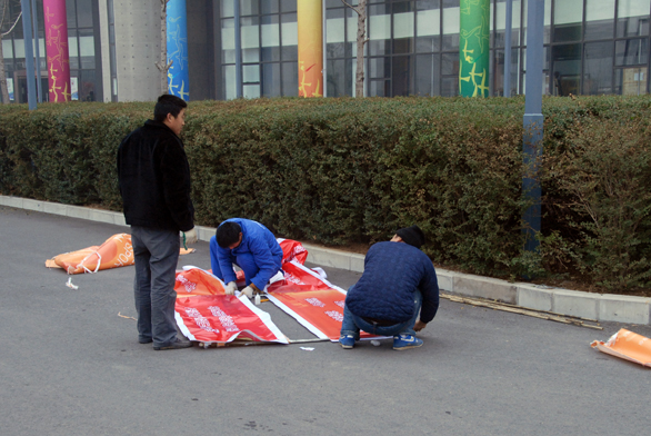 工作人员在安装党代会宣传品