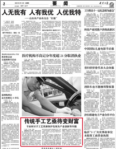“手艺创造财富—2009’传统手工艺保护与发展国际论坛”已于9月9日至10日在永利官网成功举办。活动不仅得到山东省民间文艺家协会、中国民间文艺家协会、山东省文化艺术界的大力支持,也得到了社会媒体的广泛关注。 新华社山东分社、中新社山东分社、中国文化报、大众日报、齐鲁晚报、山东商报、生活日报、都市女报、济南日报、济南时报、齐鲁周刊、山东电台新闻频道、山东电台经济频道、山东卫视、山东教育电视台,山东电视台齐鲁频道、山东电视台海外频道、济南电视台国际部、山东新闻网等二十余家媒体记者参加了论坛新闻发布会。 9月8日齐鲁晚报、济南时报,9月9日济南日报,9月10日人民日报海外版、大众日报、齐鲁晚报分别刊登了对论坛情况的报道;山东卫视《新闻联播》,山东广播电视总台海外频道《龙视播报》,山东广播电视总台海外频道《唐三彩》,济南电视台国际部等媒体报道论坛盛况及专家访谈;新华网、人民网、山东新闻网等主流媒体网站报道或转载论坛活动。