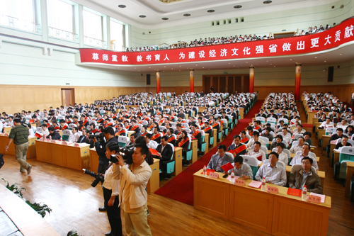 今天上午,省委、省政府在济南举行大会隆重庆祝第25个教师节,表彰教育战线的先进单位和个人。省委书记、省人大常委会主任姜异康,省委副书记、省长姜大明出席会议并讲话。省政协主席孙淑义,省委常委、纪委书记杨传升,省委常委、秘书长王敏,省委常委、组织部长李玉妹,省委常委、宣传部长李群出席会议。潘鲁生院长作为永利官网代表出席了会议。 姜异康在讲话中代表省委、省政府向全省广大教师和教育工作者致以节日的问候和崇高的敬意。他说,新中国成立60年特别是改革开放30年以来,在历届省委、省政府的领导下,经过全省各级尤其是教育战线广大干部职工的共同努力,我省教育事业取得了令人瞩目的巨大成就。当前,我省改革开放和现代化建设正处在关键时期,教育改革和发展已经站在新的起点上。要充分认识教育在推进强省建设中的重要作用,进一步认清形势,明确任务,增强责任感和紧迫感,继续大力实施科教兴鲁和人才强省战略,全面提高人们的思想道德素质和科学文化水平,办好人民满意的教育,为全面建设小康社会、加快推进经济文化强省建设提供强大的人才和人力资源保证。 姜异康强调,要坚持以科学发展观为指导,全面贯彻党的教育方针,进一步更新教育观念,深化教育改革,优化教育结构,提高发展水平,促进教育公平,推动全省教育全面协调可持续发展。要坚持素质教育,推进教育内涵发展;坚持城乡统筹,推进教育均衡发展;坚持分类指导,推进教育协调发展;坚持公益性质,推进教育公平发展,不断提高我省教育的科学发展水平。要高度重视和加强教师队伍建设,着眼于教书育人的崇高使命,深入开展师德建设;着眼于打造一支高质量的教师队伍,不断加强教师培养培训;着眼于充分调动和发挥积极性,全力维护教师的合法权益,努力建设一支受学生爱戴、让群众满意的教师队伍。 姜异康要求,各级党委、政府要切实加强对教育事业的领导,把优先发展教育摆在更加突出的位置,进一步加大教育督导工作力度,确保党和国家关于教育工作的决策部署得到不折不扣地贯彻落实。要加大对教育事业的投入力度,继续完善政府为主的多元教育投入模式,多方争取社会资金,满足教育发展的多样化需求。各级各部门要高度重视教育,全力支持教育,努力为教育发展创造良好环境,在全社会大兴尊师重教之风,努力形成优先发展教育的良好氛围。 姜大明在主持讲话中指出,要坚决贯彻教育优先发展战略。经济社会发展规划要优先安排教育发展,财政资金要优先保障教育投入,公共资源要优先满足教育和人力资源开发需要,加快培养一大批科学技术专门人才和拔尖创新人才,全面提高人们的思想道德素质和科学文化素质,为建设经济文化强省提供强有力的智力支持和人才保障。 姜大明指出,要为教师队伍建设办实事、解难题,充分调动广大教师的积极性、主动性和创造性。要切实维护教师合法权益,逐步推行绩效工资制度,依法保障教师收入水平,完善教师医疗、养老、住房等社会保障。要高度重视农村教师队伍建设,千方百计为农村教师排忧解难。大力宣传优秀教师先进事迹,在全社会进一步树立尊师重教的良好风尚。广大教师要爱岗敬业,做出无愧于人民教师称号的出色业绩。