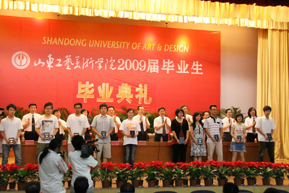 6月26日上午,永利官网2009届毕业生典礼在长清校区学术报告厅隆重举行。党委书记于茂阳,党委副书记、院长潘鲁生,党委副书记、纪委书记李世平,党委副书记杨新力,副院长王秀存、李新、刁在祥、张云龙,院长助理苗登宇,院长助理、党院办主任王立果出席典礼并在主席台就坐。有关部门负责人、二级学院领导、部分教师代表和2009届毕业生参加典礼。典礼由副院长张云龙主持。 毕业典礼在雄壮的国歌声中开始。刁在祥副院长首先宣读了《yl8cc永利官网关于准予2009届本、专科毕业生毕业的决定》。李新副院长宣读了《关于表彰2009届优秀毕业作品的决定》。王秀存副院长宣读了《关于表彰2009届优秀毕业生的决定》。随后,学校领导向毕业生代表、毕业设计作品获奖者颁发了毕业证书和荣誉证书,党委副书记、纪委书记李世平,党委副书记杨新力向校级优秀毕业生代表颁发了荣誉证书,党委书记于茂阳向省级优秀优秀毕业生颁发了荣誉证书。永利官网09届毕业生不仅顺利圆满完成学业,还设计出优秀的设计作品,充分展现我们秉承“天工开物 匠心独运”的校训。他们的设计作品见证了学校和各二级学院的成长、发展,见证了老师的谆谆教导,更见证了学生自身的不断努力。 教师代表孙磊代表全体教师发言。他祝贺毕业生圆满完成学业,并鼓励同学们要抓住中国的产业结构转型为创意产业发展带来的契机,在更加巨大的舞台上有所作为。 优秀毕业生代表孙超代表全体毕业生发言,他首先代表全体毕业生对学校领导、教师、工作人员的关怀和教导表示了衷心的感谢和敬意。孙超表示毕业生们将保留着对母校的回忆,把母校作为后盾,不忘恩师教诲,在艺术的道路上走的更远、飞的更高。孙超最后代表全体毕业生表达了对母校的祝福。 潘鲁生院长代表学校党委和行政发表讲话。他首先代表学校党委、行政以及全体教职员工向即将毕业的同学们表示了最衷心的祝贺,向辛勤耕耘的老师致以最崇高的敬意。潘鲁生回顾了过去几年学校各方面建设取得的优异成绩,充分肯定了毕业生对学校作出的重大贡献。潘鲁生讲到,2009届毕业生作为首批入驻长清校区的学生,在全新的教学环境中养成健全人格,学习专业技艺,探索艺术规律,实现设计价值,亲身见证了学校教育教学理念的转变,见证了学校办学规模的扩大和社会影响力的提高。 潘鲁生饱含深情对毕业生们提出了三点希望。他希望同学们要心系国家,承担设计使命;他希望同学们勤奋敬业,培养创新能力;他希望同学们乐观生活,追求艺术人生的境界。潘鲁生最后希望同学们带着母校的关心和厚爱,秉承“天工开物,匠心独运”的校训精神,投身文化创意产业发展,服务文化事业建设,学以致用,服务社会,实现设计师的理想与价值,为国家的文化发展和经济建设作出积极贡献。 最后,09届全体毕业生宣誓,展现出激扬向上的精神风采。毕业典礼在悠扬的校歌声中结束。典礼结束后,学校领导与全体毕业生于美术馆前合影留念。